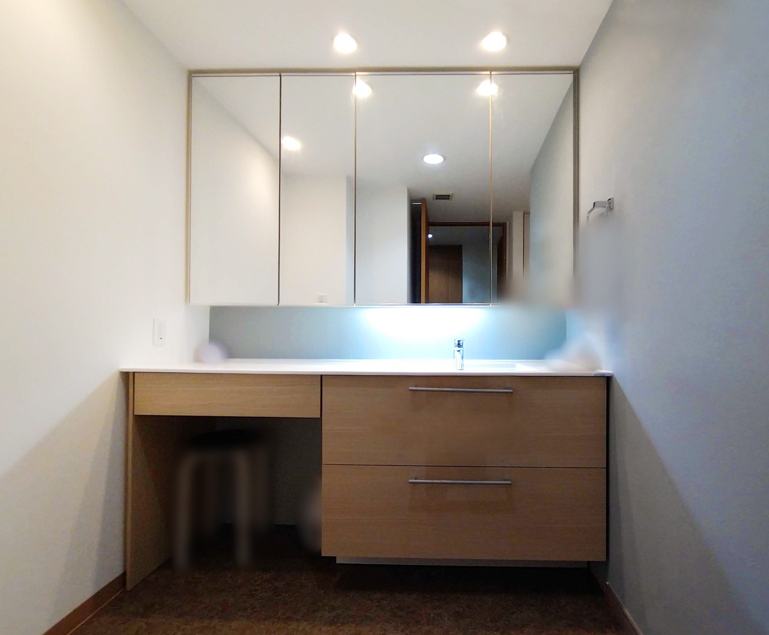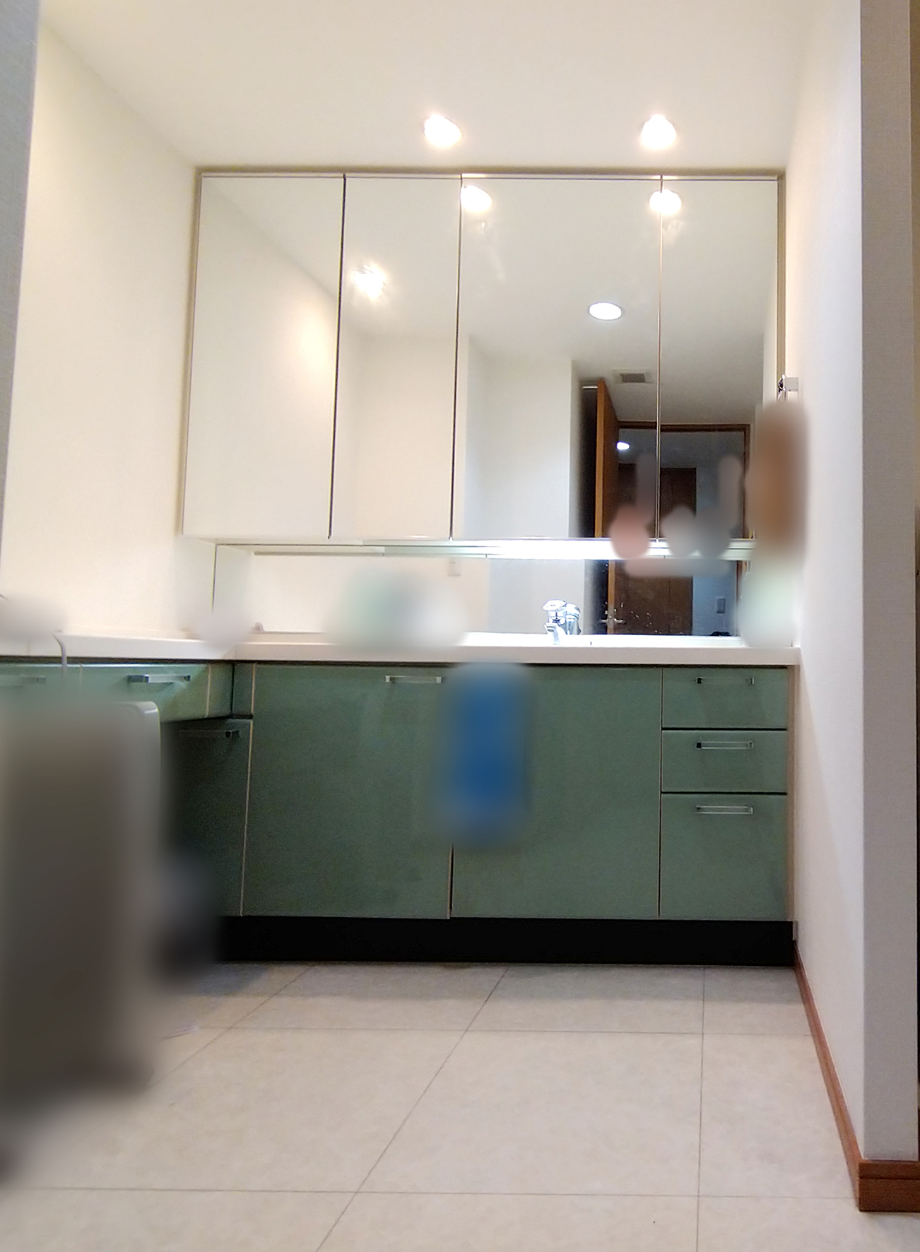 洗面台の既存鏡は再利用するので、そちらも最新の注意を払います。