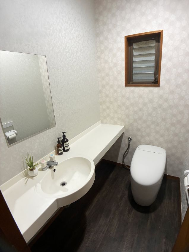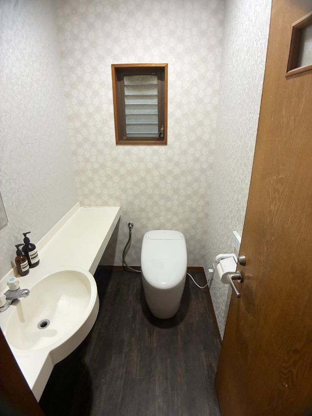 淡い色の壁紙と、落ち着きのあるダークな木目床が調和した、上品で落ち着きのあるトイレ空間が完成しました。