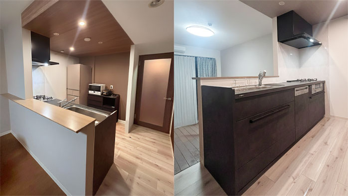 壁に囲われて閉鎖的でしたが、壁を解体したことで開放的なキッチンが完成しました。