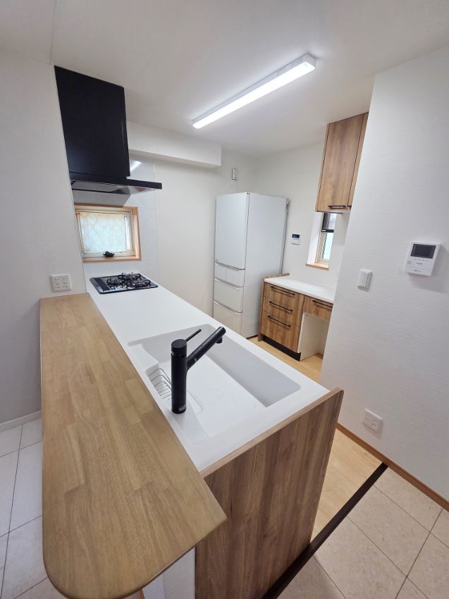 L型からI型に変更になり、カウンター交換やコンセント位置の移動を行いました。