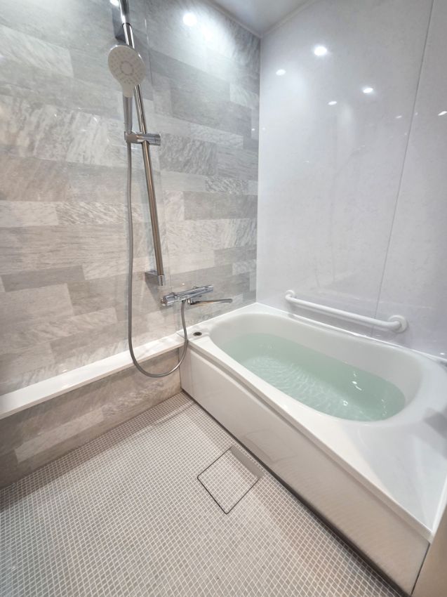 パティオホワイトのアクセントパネルが映える素敵なお風呂になりました。