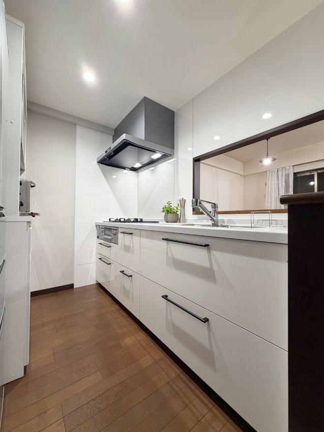 キッチンは、シンプルな仕様ですが、扉色をホワイトにしたことで、床材は既存のままですが、全体的に明るく仕上がりました。