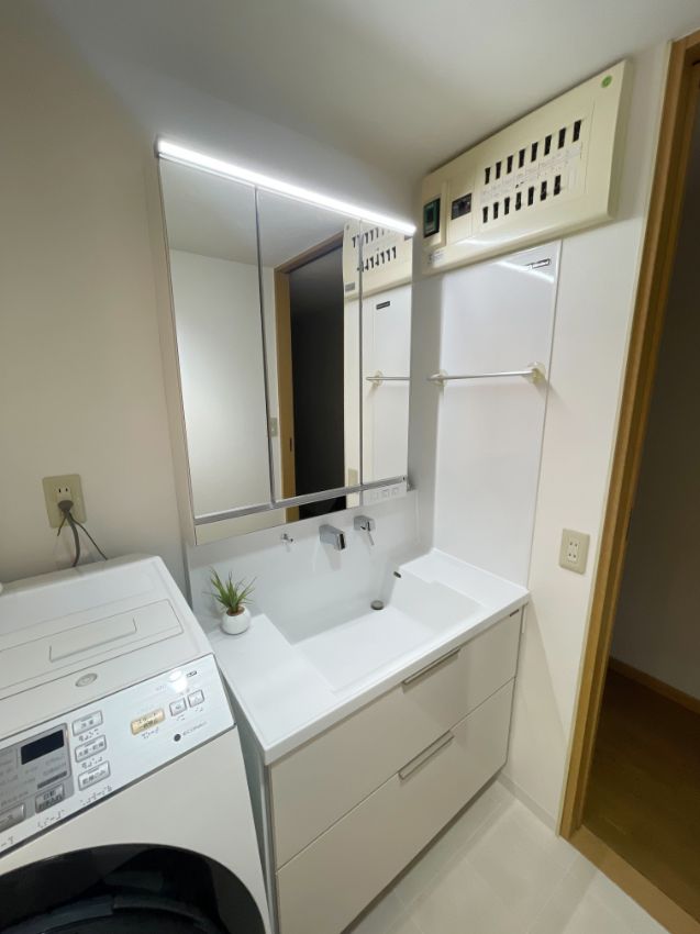 三面鏡になり収納力がアップした洗面台が完成しました。
