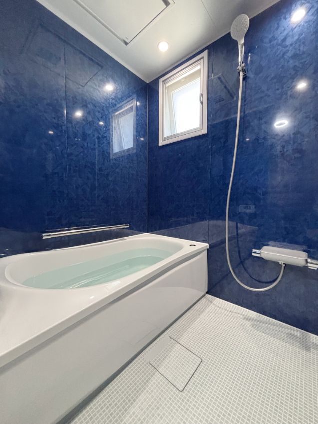 ベルセシーブルーのパネルが高級感と落ち着きを演出する、上品な浴室が完成しました。
