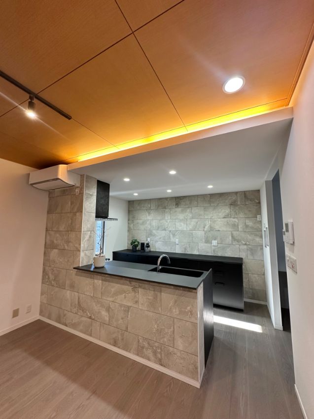 こだわりのキッチンスペースは天井を15㎝程下げて間接照明を設置しました。