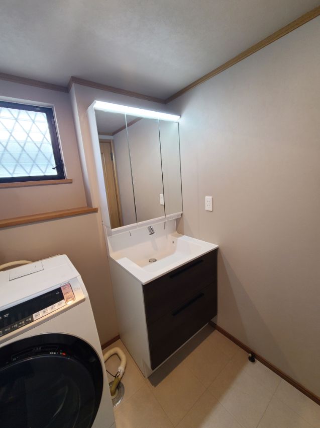 洗面台の扉の色をダーク調にした事で洗面所の雰囲気も一新されました。