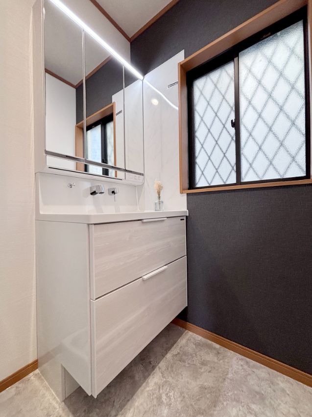 ネイビーのアクセントクロスが映える素敵な洗面空間が完成しました。