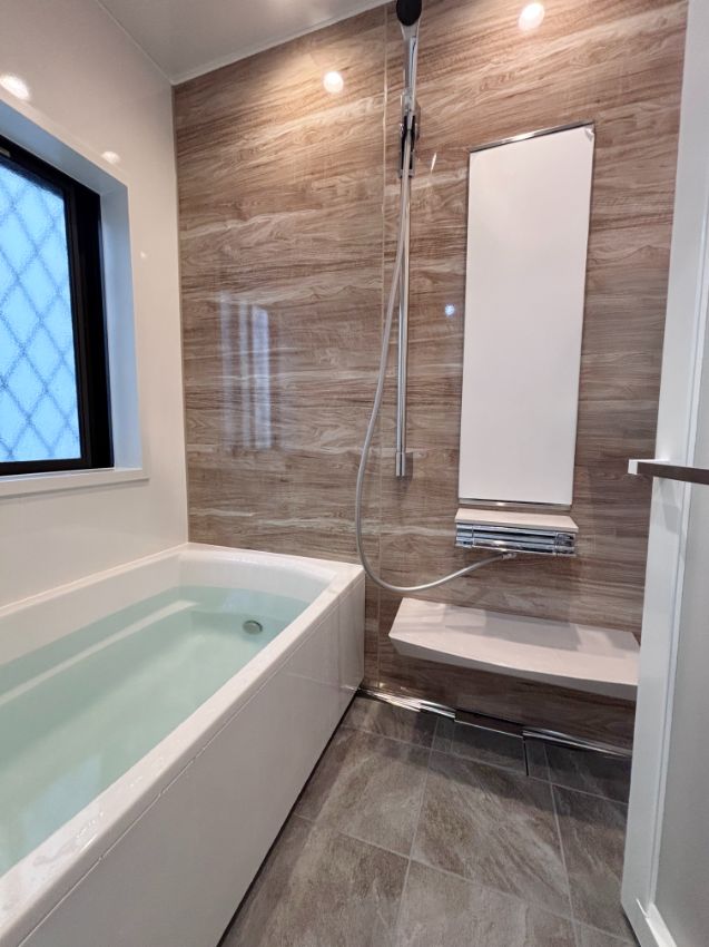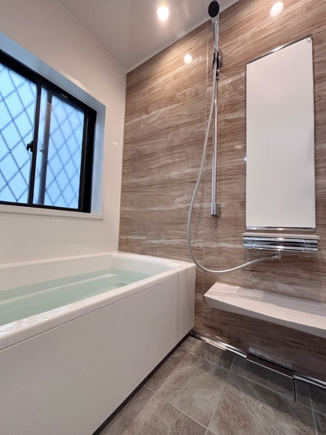 チェスナットベージュのアクセントパネルとサンディグレーの床が映える素敵なお風呂空間が完了しました。
