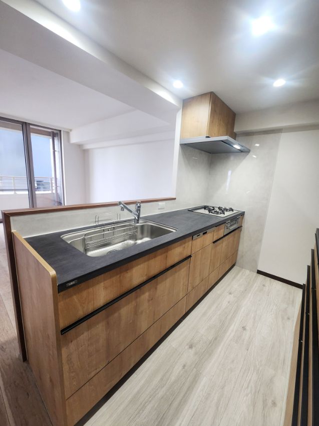 ブラックの天板が上品な、オシャレなキッチンが完成しました。