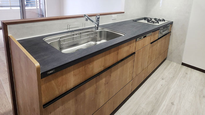 ブラックの天板が上品な、オシャレなキッチンが完成しました。