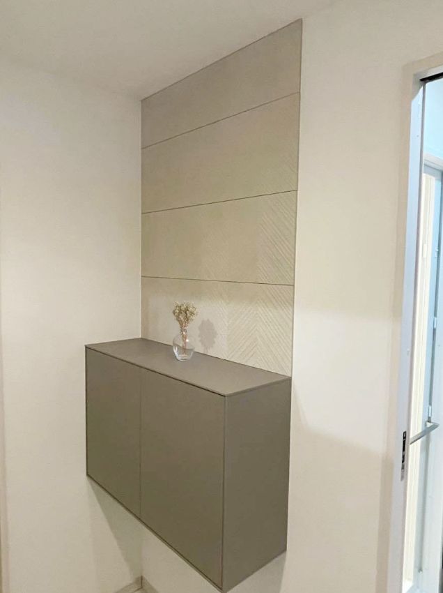 玄関収納の上に平田タイルを貼ることでクロスでは表せない質感のアクセントになりました。