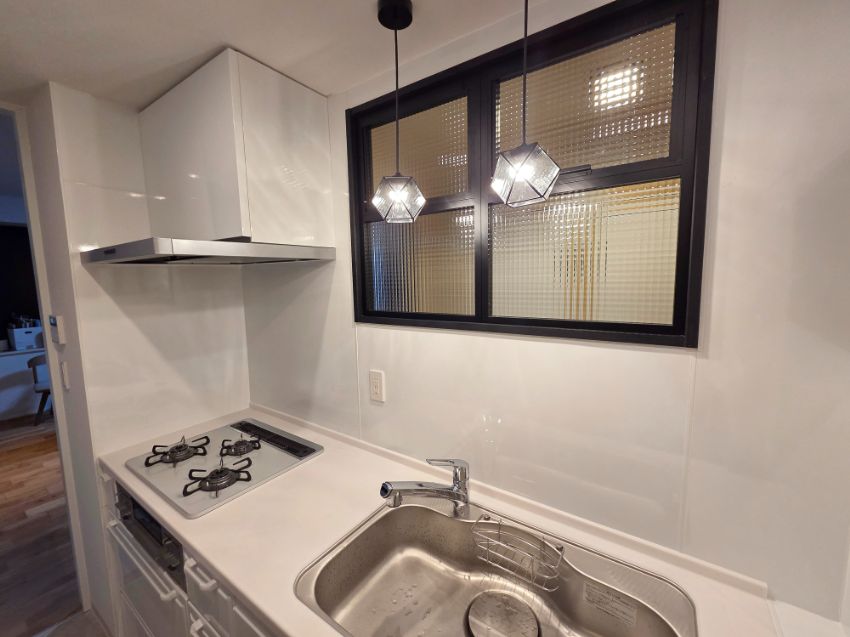 ガラス窓とペンダントライトが映えるキッチン|台東区