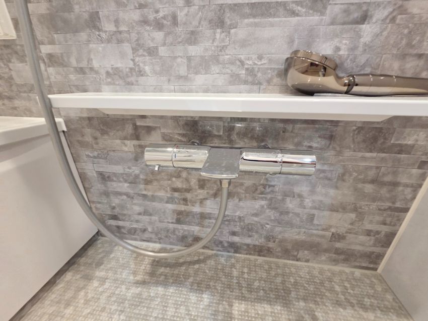 クレアライトグレーのアクセントパネルが光る素敵なお風呂空間が完了しました。