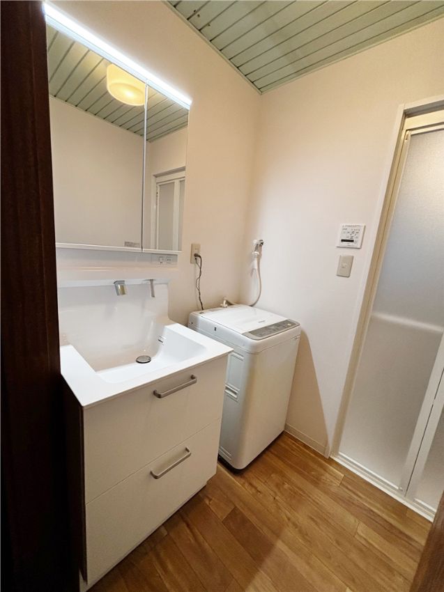 洗面室全体が白で統一され、明るく清潔感のある空間が完成しました。