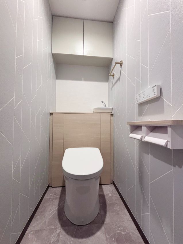 両サイドのくすみブルーの壁紙が映える、素敵なトイレ空間が完了しました。