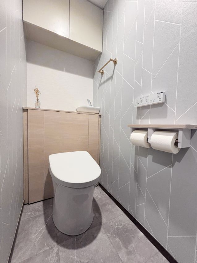 くすみブルー×石目調が映えるトイレリフォーム|さいたま市