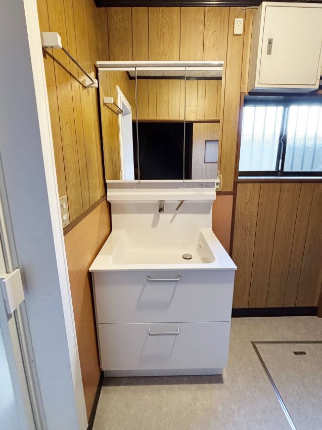 木質感の残る空間になじむ、明るく清潔感のある洗面台が完成しました。