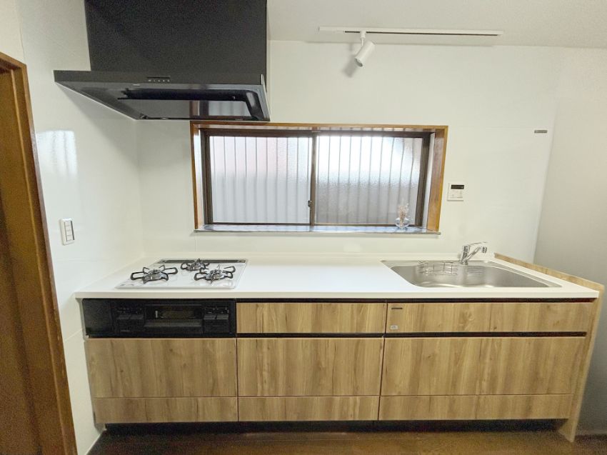 木目の扉と白い天板が空間になじむ、明るくナチュラルなキッチンが完成しました。