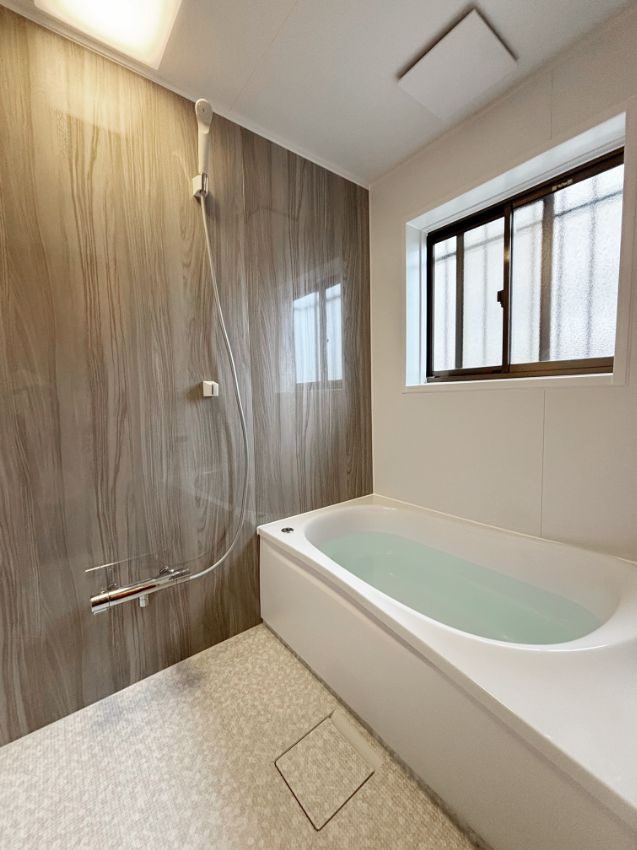 グレイッシュウォルナットのアクセントパネルが映える素敵なお風呂が完成しました。
