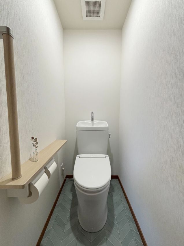 緑青のヘリンボーン柄の床が素敵なトイレ空間が完成しました。