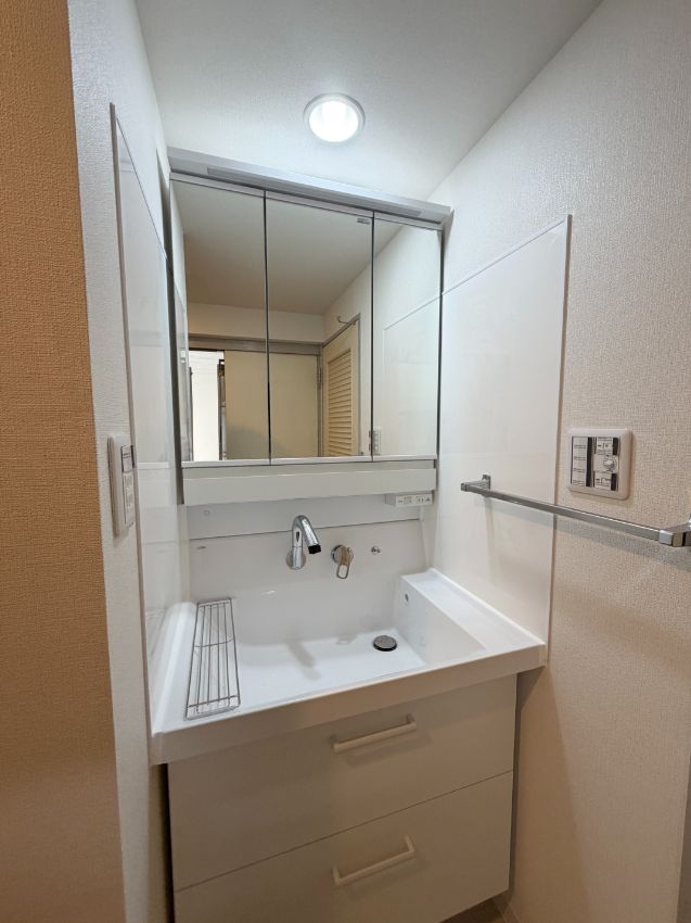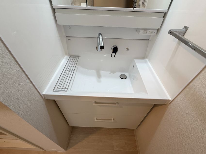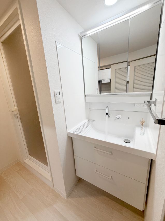 三面鏡で収納力アップした素敵な洗面空間が完成しました。