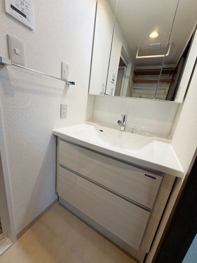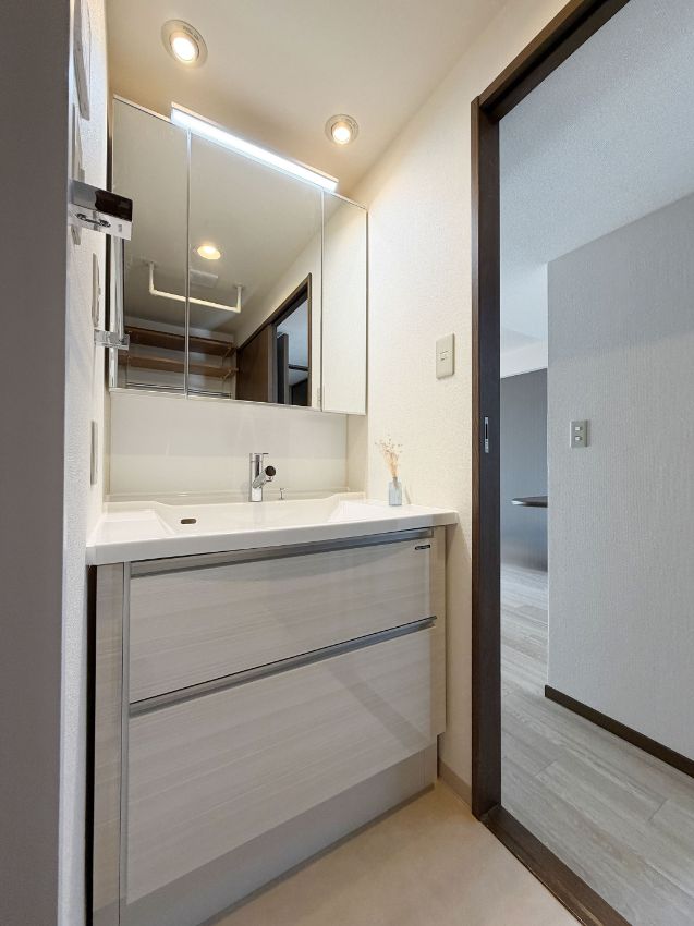 三面鏡で収納力たっぷり&使いやすさ抜群な洗面台が完成しました。