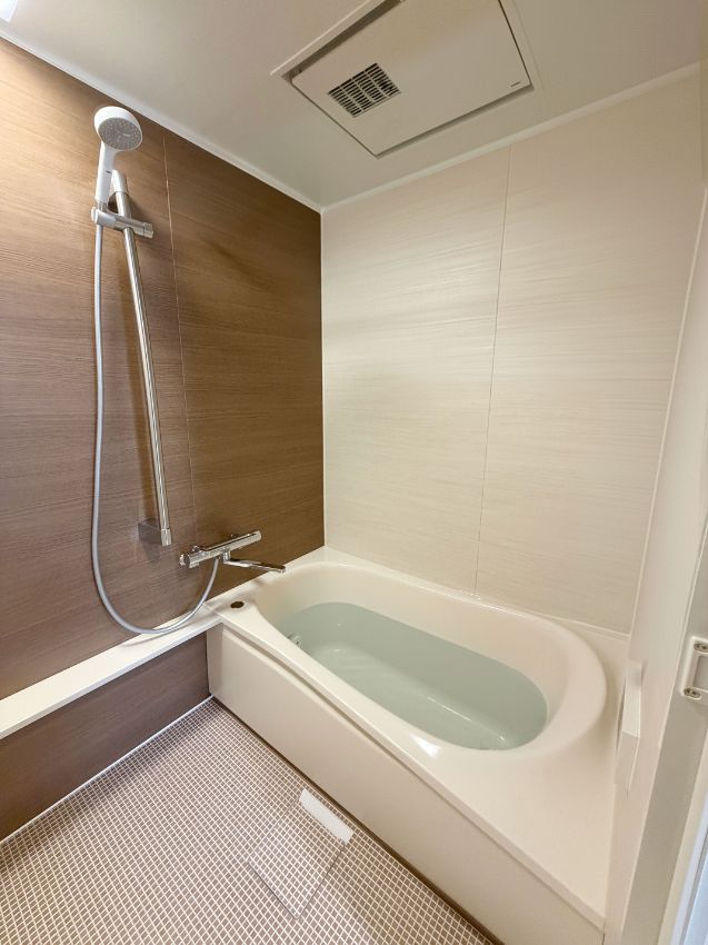 落ち着いた木目と柔らかなベージュでまとめた、ホテルライクなお風呂が完成しました。