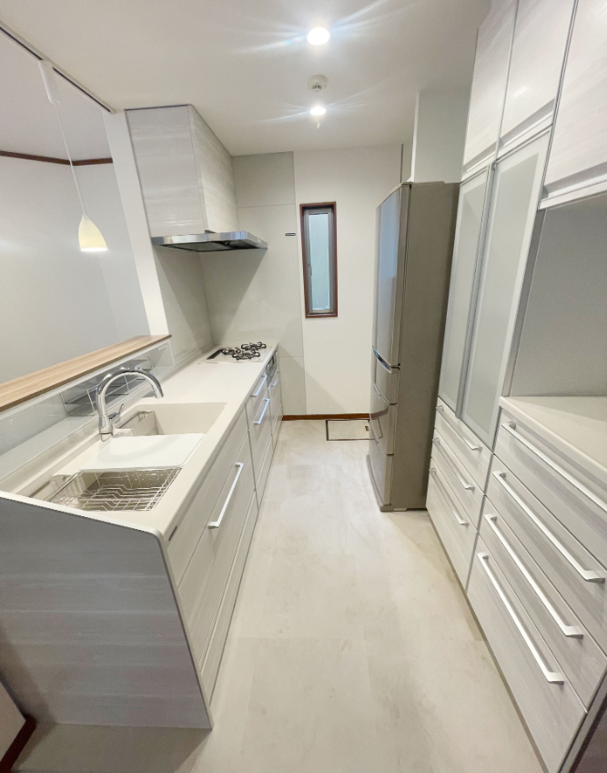 冷蔵庫の配置を見直すことで使い勝手が良くなり、すっきりとした開放的なキッチン空間が完成しました。