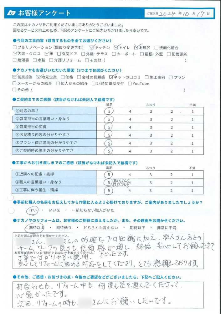 お客様のアンケートの内容をご紹介しました。 スタッフ一同温かい気持ちでいっぱいです。 今後もお困りの事等ございましたら、お気軽にご相談ください。