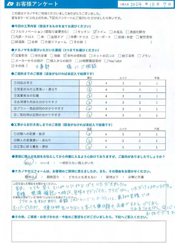 当日、とても早くていねいに仕上げていただきました。見積、現場確認の時は色味のアドバイス、さりげなく、いただけてよかったです。リフォームをするにあたり、金額このぐらいでとお願いし、最初の見積ではオーバーでしたが、不要な物をいらないと言っても嫌な顔や、必要ですよとごりおしされることもなく安心してお任せできると思いました。