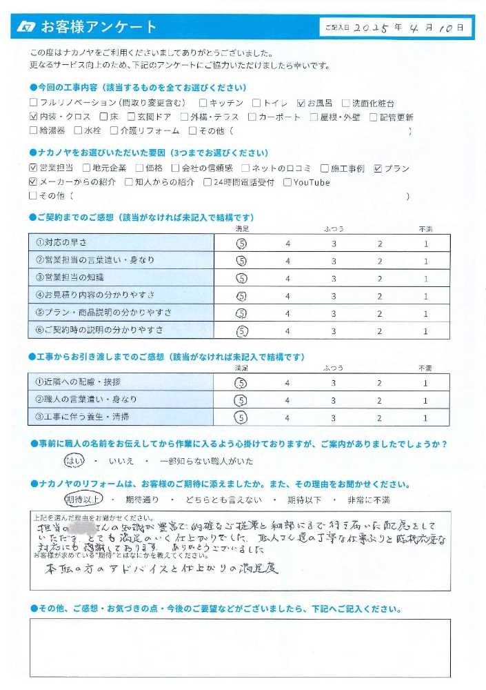担当さんの知識が豊富で的確なご提案を細部にまで行き届いた配慮をしていただき、とても満足のいく仕上りでした。