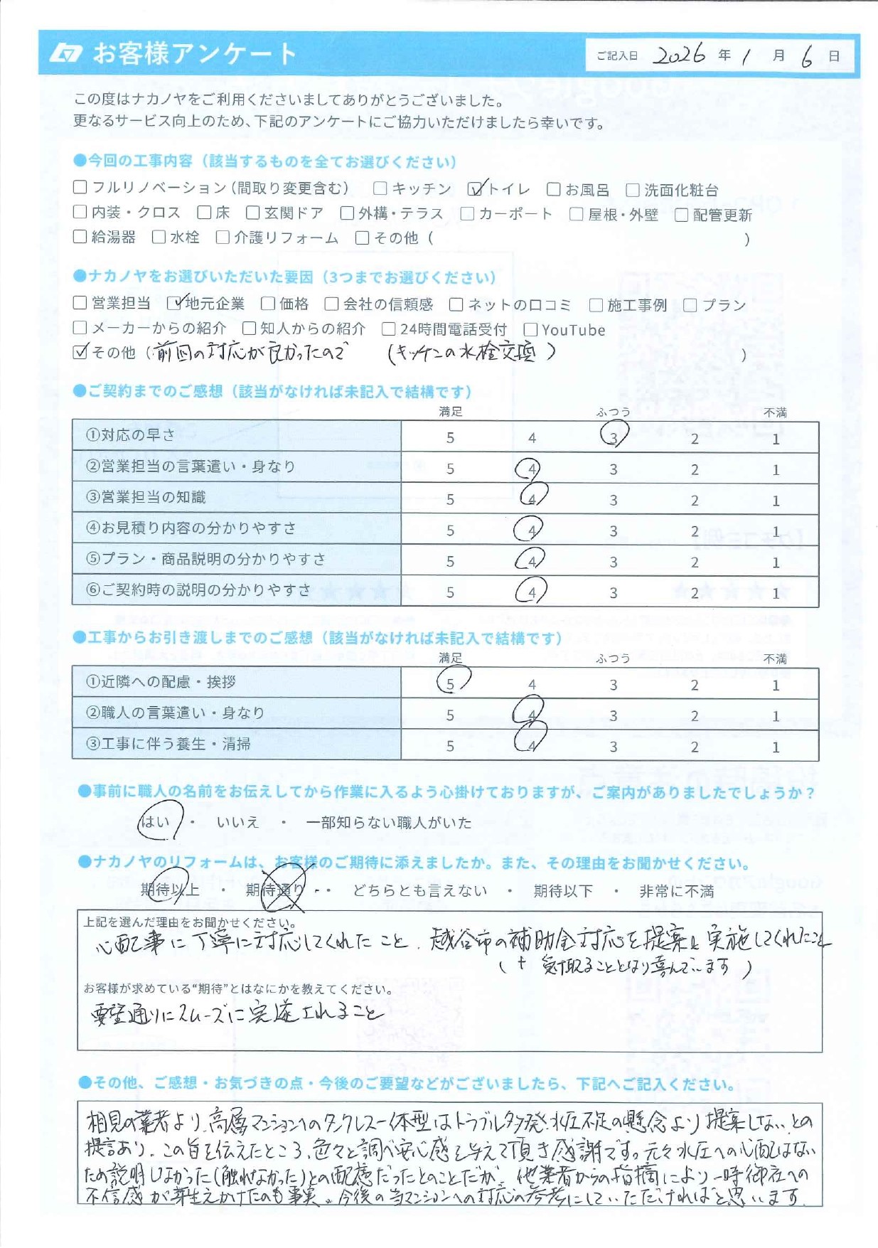 相見積の業者より、高層マンションへのタンクレス一体型はトラブル多発、水圧不足の懸念により提案しないとの提言あり、この旨を伝えたところ、色々と調べ安心感を与えて頂き感謝です。